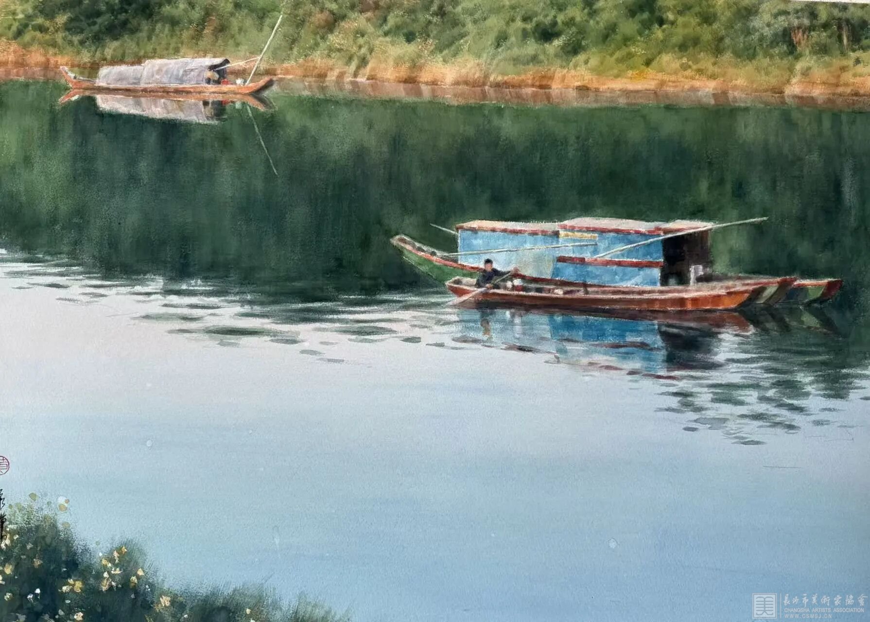 浏阳河九曲蜿蜒,静水深流,名扬天下。浏阳河不仅孕育了一方水土,更承载着千年文脉,涵养星城独有的风致和气韵。它是灵动的自然之河,碧水绕青山,岁岁伴流年;是厚重的文化之河,湘韵楚风绵延,铸就湖湘精神;更是长沙人心底的母亲河,一汪碧水,牵系万千乡愁。浏阳河汇湘江、入洞庭、奔长江、向大海……一如那首传唱天下的湖南民歌,牵引着家国之思,牵挂着家乡之恋,总让人欢喜、沉醉、自豪。千年河韵浸润人心,也在艺术的天地里绽放光彩。一湾清流入画,万般乡情落笔,便有了今天黄承谦先生笔下这卷流光溢彩、动人心弦的时代图景。